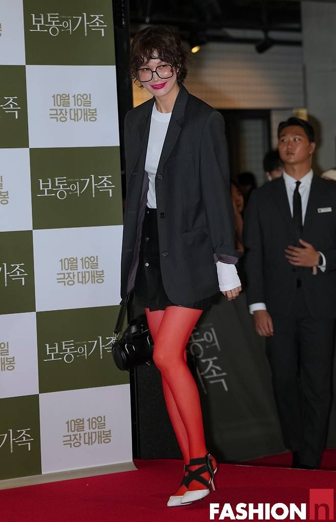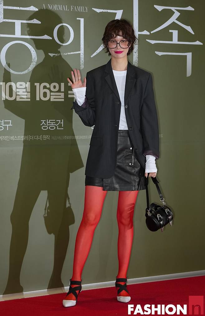 이날 송경아는 히피펌에 커다란 뿔테 안경을 쓰고 빨간 스타킹에 블랙 미니 스커트와 화이트 티셔츠를 입고 슈트 재킷을 걸친 90년대 레트로 스타일의 시사회룩을 시선을 강탈했다.