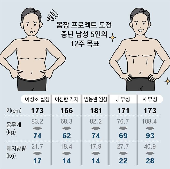2025년 을사년(乙巳年) 새해를 맞아 중년 남성 5명이 12주 동안 몸짱 프로젝트에 도전한다. 도전자는 이진한 본보 의학전문기자, 임동권 센트럴제일안과 원장, 이성호 센트럴서울안과 실장, 직장인 J 부장과 K 부장이다.