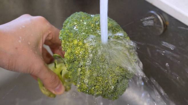 브로콜리를 깨끗이 씻기 위해선 꽃봉오리를 열어 씻어 주는 과정이 중요해요. 꽃봉오리를 열기 위해선 물속에 담가야 하는데요.