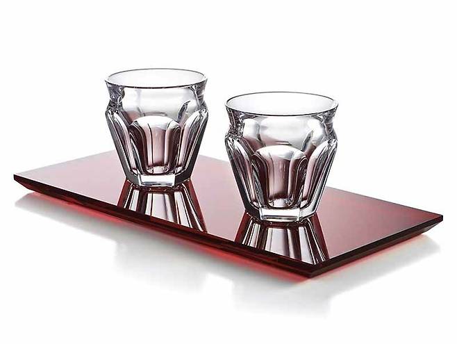 대담한 빨간색 트레이와 반짝이는 두 개의 크리스털 잔으로 구성된