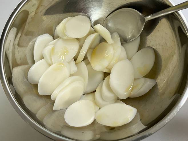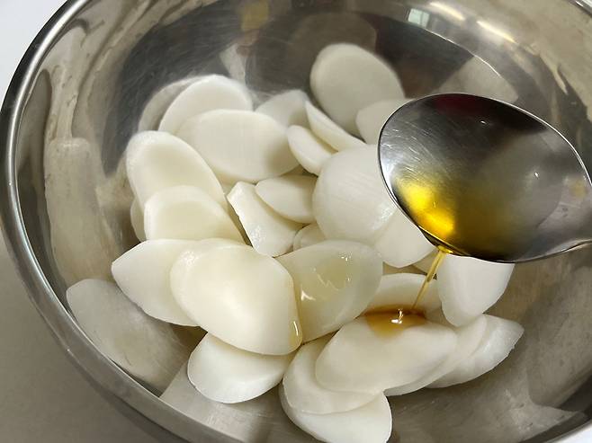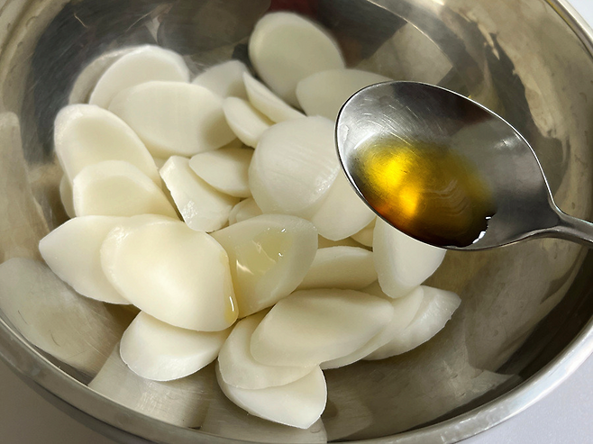 떡국떡에 기름을 한 스푼 뿌린 다음에는 골고루 섞어서 떡에 기름이 고루 코팅되도록 해 주세요.