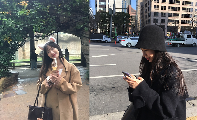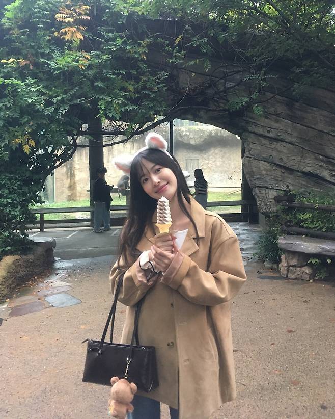 아이스크림을 들고 있는 지우는 카멜 색상의 트렌치코트와 토끼 머리띠를 착용하여 사랑스러운 분위기를 연출했다. 코트의 자연스러운 핏과 액세서리, 가방에 달린 곰인형 키링은 편안하면서도 개성 있는 스타일을 완성한다. 은은한 미소는 그녀의 매력을 한층 더 돋보이게 한다.