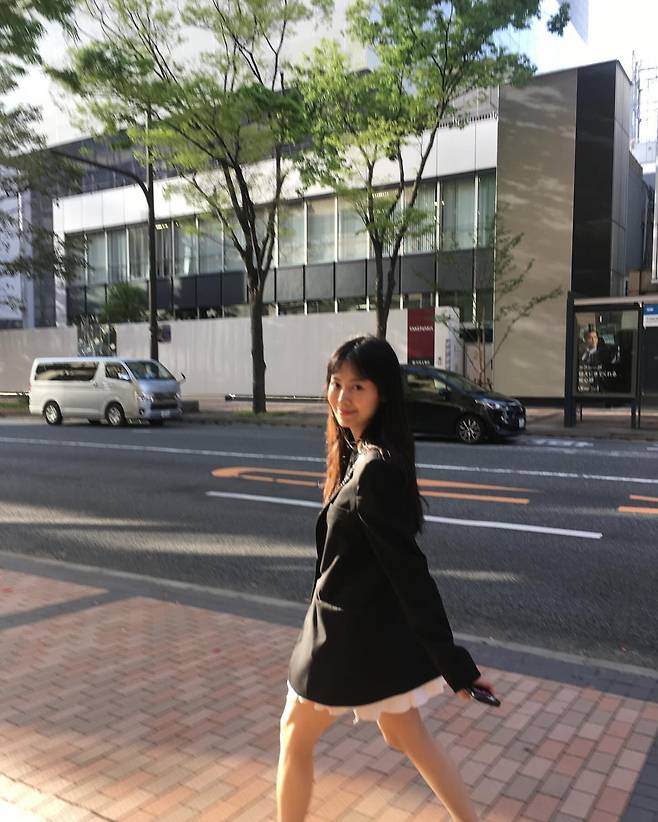 길거리에서 포착된 지우는 블랙 재킷과 화이트 스커트를 매치하여 시크하면서도 편안한 스타일을 선보였다. 재킷의 각진 어깨 라인은 세련미를 더하고, 짧은 스커트와 스니커즈는 활동적인 느낌을 준다. 자연스러운 헤어스타일과 밝은 미소가 전체적인 룩에 생기를 불어넣는다.