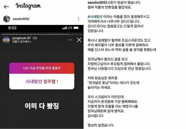 -드라마 자체가 재미있어서 입소문이 되었지만, 방탄소년단 멤버 정국인 정국이 인스타그램 스토리에 사내맞선을 이미 정주행했다는 소식을 업로드해 아미들도 함께 시청한 것이 큰 효과를 불러왔다. 덕분에 배우들의 인스타그램 방문도 급증했다고 한다.