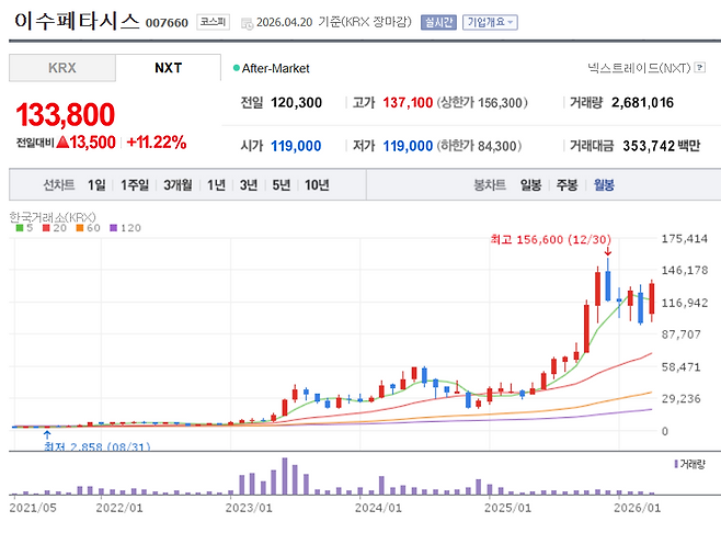 저점 2,858원 매수자는 지금 +4,580% 수익이지만, 최고점 156,600원 매수자는 -14.6% 손실 중이다. 이미 많이 올랐다는 사실을 부정할 수 없다.