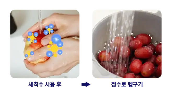 마찬가지 이유로 과일, 채소 등 식재료는 물론, 정수기 부품, 아이 장난감 등을 전기분해수로 세척했다면, 정수물로 헹구는 것이 좋습니다.