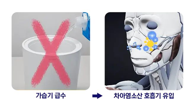 가습기를 살균하기 위해 간혹 전기분해수를 가습기에 넣고 작동하는 사례들이 있습니다. 가습기를 통하면 호흡기를 통해 바로 살균성분이 들어오게 되기 때문에 매우 위험합니다. 실제 문의도 많은 사항이기 때문에 관련 내용이 항상 명시되어 있기도 합니다. 가습기를 사용한다면 꼭 주의해야 할 내용입니다.