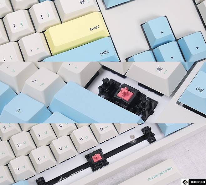 거기다 LED 조명이 많이 사용되다 보니 빛을 투과시키기 위해 이중 사출 방식이 보편화됐는데 토체프 D&T 콜라보 체리키보드는 이중 사출이 아닌 염료승화 방식으로 제작된 키 캡이 적용됐다.