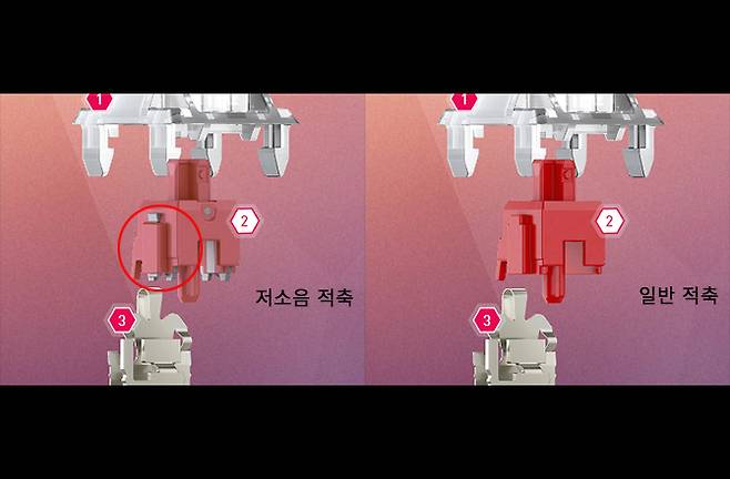 이런 구조는 흔히 말하는 통울림 소리가 적고 신경을 거스르는 타이핑 소음도 없어 일반 기계식 키보드와 비교하면 그 차이가 매우 크게 느껴지는데 이 차이를 비교한 것이 바로 위 영상이다.