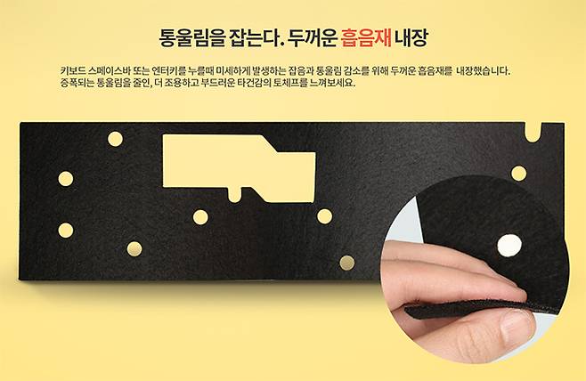 키보드 전체 크기로 제단 된 흡음 패드를 하판 바디와 PCB 사이에 넣어 스위치에서 PCB로 전달된 진동이 하우징을 울리는 것을 방지하고 피크치가 높은 음역대까지 흡수하도록 만든 것이다.