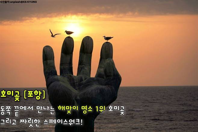 한반도 동쪽 끝 호미곶에서 상생의 손과 사진도 찍고, 환호공원 스페이스워크에 가서 독특한 체험도 즐겨보세요.