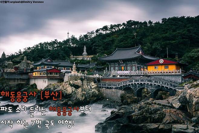 7번 국도 여행의 시작점인 부산, 바다와 사찰이 어우러진 해동용궁사에서 시작해 보세요. 파도치는 모습과 사찰 특유의 고즈넉함, 그리고 듣기 좋은 목탁 소리까지.