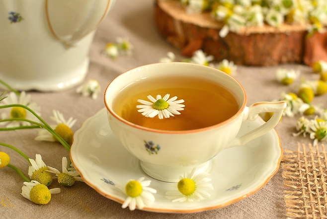 잠들기 30분 전, 따뜻한 캐모마일차 한 잔으로 하루의 피로를 풀어보세요.