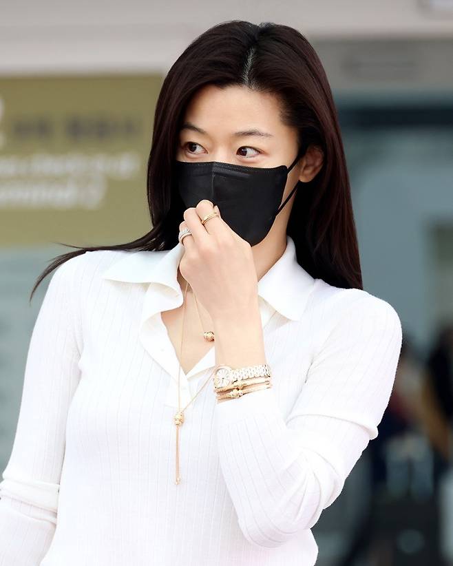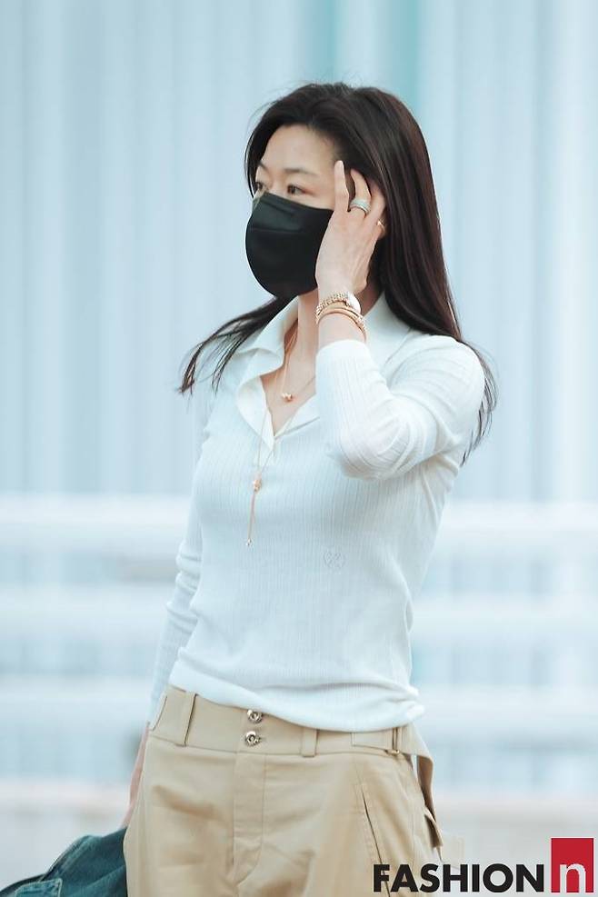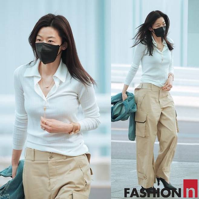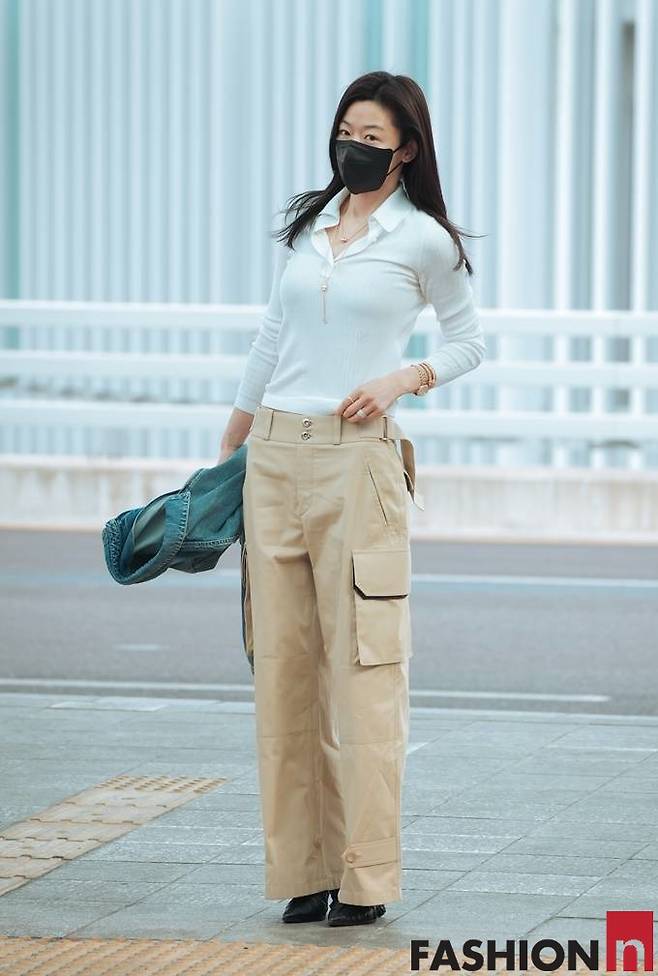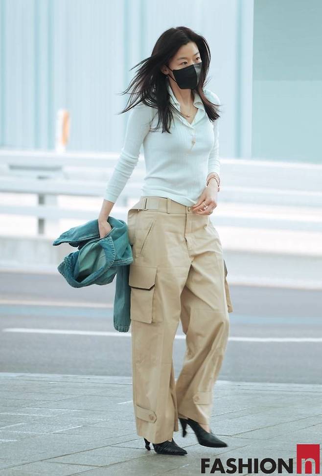 전지현은 이날 화이트 니트 셔츠와 베이지 카고 팬츠, 여기에 데님 재킷을 손에 걸친 무심한 듯 세련된 드뮤어룩으로 공항을 완성했다.
