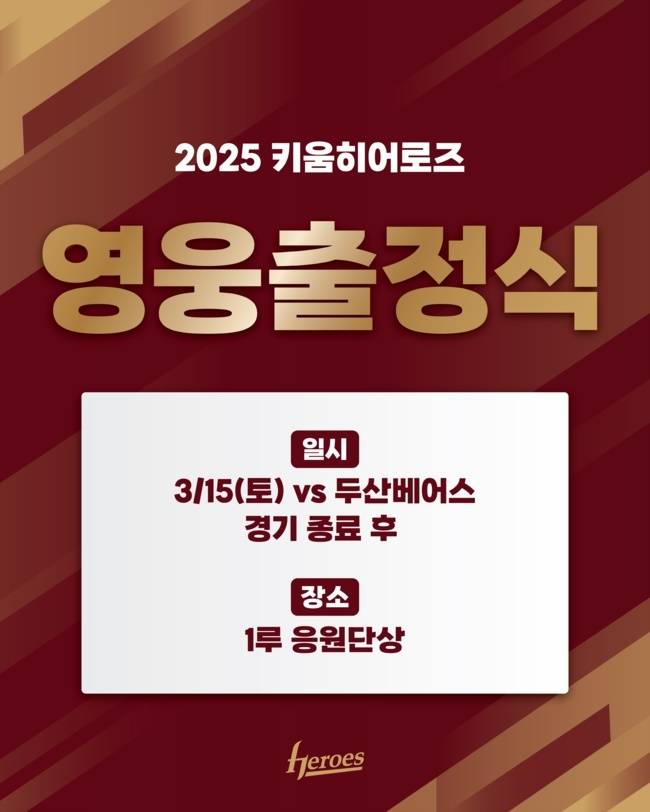 키움히어로즈(대표이사 위재민)는 3월 13일 "15일(토) 서울 고척스카이돔에서 열리는 두산베어스와 시범경기 종료 후 1루 응원단상에서 2025시즌 '영웅출정식'을 개최한다"고 밝혔다.
