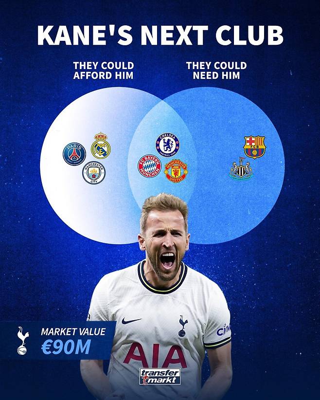 유럽 축구 통계 매체 ‘트랜스퍼마크트’는 지난 29일(현지시간) 케인의 이적 전망을 집합 공식으로 정리해 보도했다.
