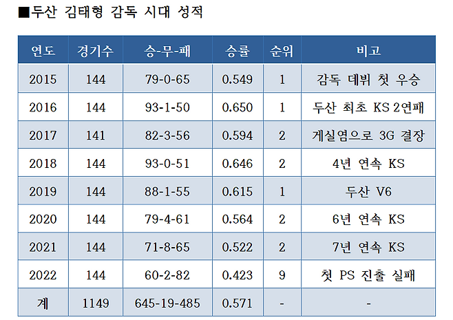 하지만 2022년 최악의 성적표를 받아 들면서 두산과 김태형 감독의 30년 인연도 끝났다.
