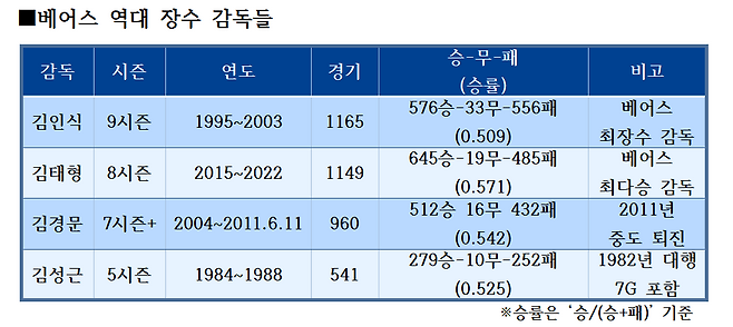 김태형 감독은 비록 팀을 떠나게 됐지만 베어스 역사에 큰 발자국을 남겼다. 1990년 선수로 입단한 뒤 2022년까지 정확히 30년간(2012~2014년 SK 와이번스 코치 기간 제외) 베어스 유니폼을 입었다. 선수로서, 코치로서, 감독으로서 현장에서 30년간 베어스 유니폼을 입은 인물은 구단 역사상 현재까지 김태형이 유일하다.