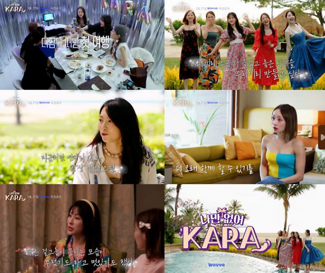 또한 27일 첫 공개된 '나만 없어, 카라'로 완전체로 예능에 등장합니다. 여행 리얼리티 예능으로 데뷔 15년을 맞이한 국내 대표 걸그룹 카라의 여행 이야기를 담았습니다.