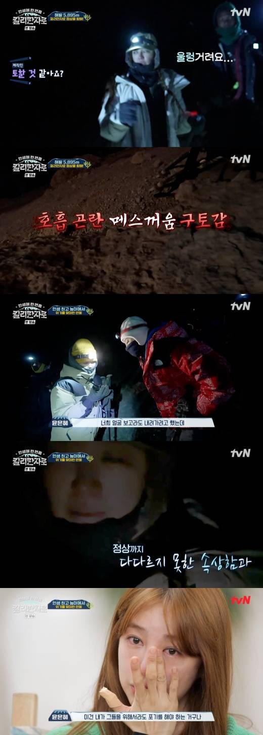 결국 윤은혜는 “너무 힘들다. 숨이 안 쉬어진다. 못 올라갈 것 같다. 애들 얼굴이라도 보고 가고 싶다”며 선발대에 무전을 연결했다.