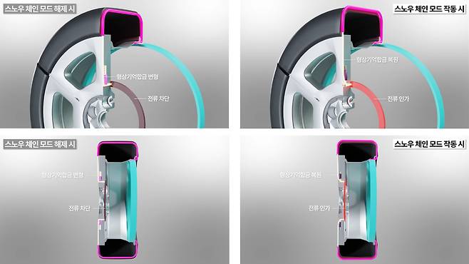 먼저, 이 기술은 형상기억합금으로 이뤄진 모듈이 평상시에는 휠과 타이어 내부에 숨어있다가 전기적 신호를 받으면 타이어 바깥으로 돌출되며 스노우 체인의 역할을 하는 원리다.