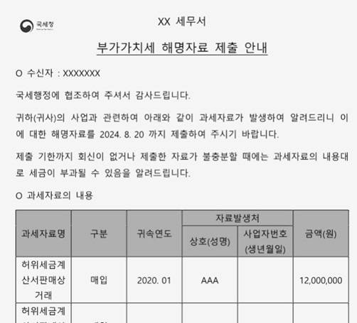 그런데 반대로 세금계산서를 발급한 사업자는 부가가치세 1백만원과 종합소득세 2백만원(소득세율 20% 가정)을 합해 3백만원의 세금을 내야 한다. 하지만 받은 돈은 50만원밖에 안 되니 이 상황에서 정상적인 신고를 기대하기는 어렵다.부가가치세 신고 시 세금계산서가 함께 제출되는데 국세청 입장에서는 발급한 쪽과 발급받은 쪽이 동일한 금액으로 신고가 들어와야 정상적인 것으로 본다. 그런데 매입만 들어오고 매출이 들어오지 않으면 오류가 뜬다. 이러한 이유로 발급한 사업자(자료상)를 조사하다 보면 이 사업자와 거래한 모든 거래 건을 살펴보게 되고, 이 과정에서 상대 거래처에 해명자료 제출 안내문을 발송하게 되는 것이다.