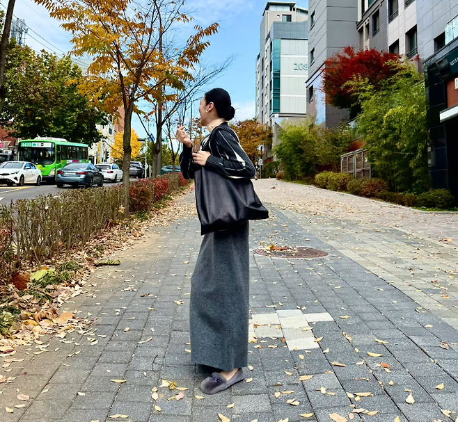 차지연 님의 그레이룩은 고급스럽고 차분한 느낌을 주는데요. 스트라이프 패턴의 그레이 니트 가디건과 롱스커트, 그리고 벨벳 로퍼와 가죽 숄더백까지 더해진 일상룩을 완성했어요.