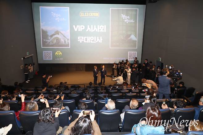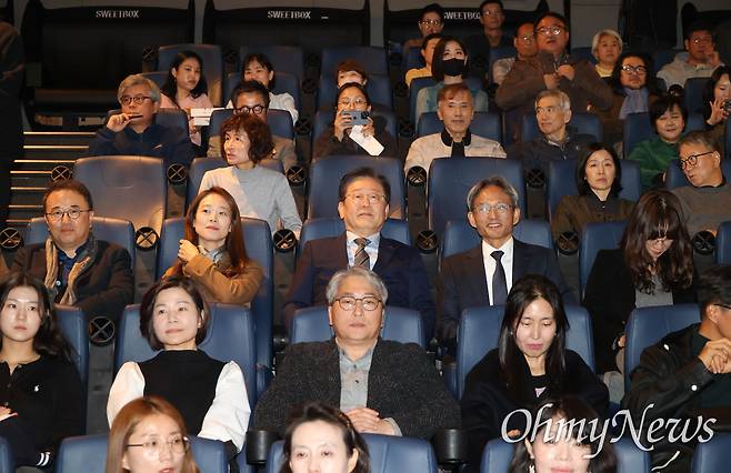 | ▲ 11월 7일 오후 서울 용산CGV 아이파크몰에서는 정치인, 문화예술인, 언론인과 '100개의 극장 프로젝트' 관객추진단, 제작진과 출연 배우 등 140여 명이 모인 VIP 시사회가 열렸다. 영화평론가인 강유정 민주당 의원(맨 오른쪽). |
