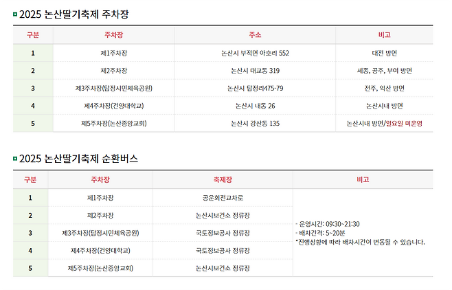 처음 가는 분들은 주차가 고민일 수 있는데, 다녀온 입장에서 가장 추천하고 싶은 건 제1주차장이에요. 아호리 552 위치에 있는 이곳은 셔틀버스 연계가 잘 되어 있어서 이동이 편했고, 주차도 꽤 여유 있었답니다. 논산시 전역에 총 5개의 임시주차장이 운영되는데, 일요일엔 일부 주차장이 쉬기 때문에 방문 전 체크는 필수예요.