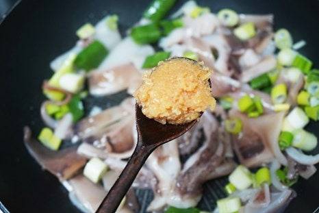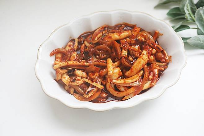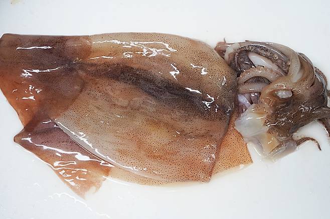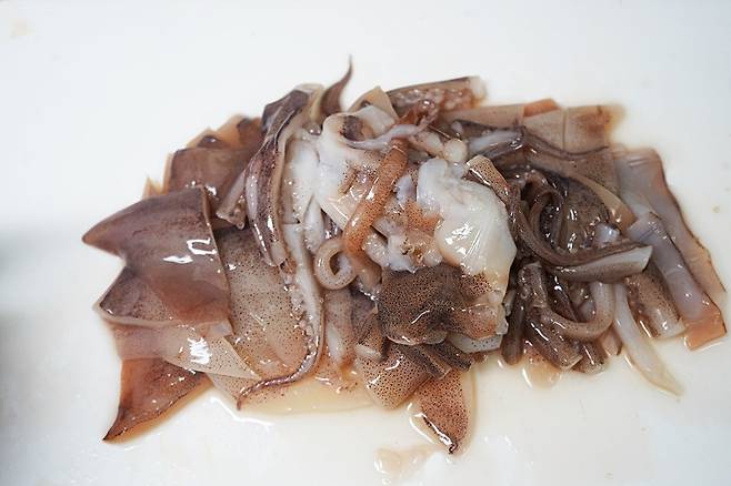 생오징어를 사용할 경우 내장을 제거하고 껍질을 벗겨 사용하면 더 부드러운 식감을 즐길 수 있어요.