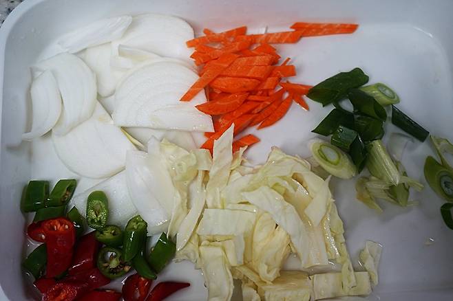 저는 기본적으로 대파, 양파, 당근, 고추, 양배추를 넣었어요.