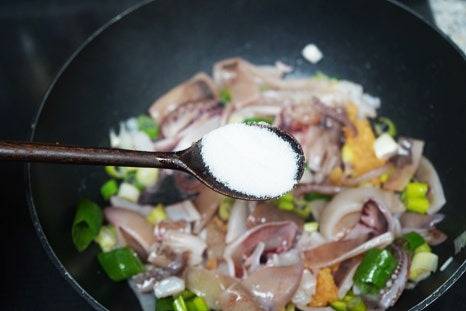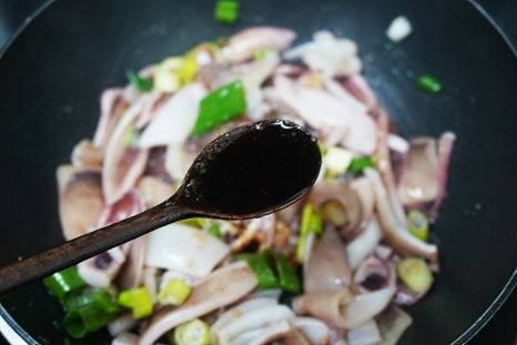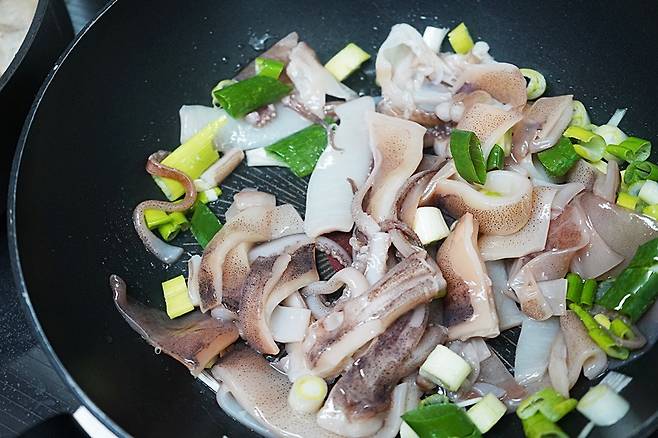 손질한 오징어를 팬에 넣고 살짝 볶아줬어요.