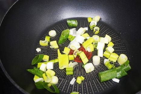 중불로 달군 팬에 식용유 2큰술을 두르고 대파를 넣어 볶아줬어요.