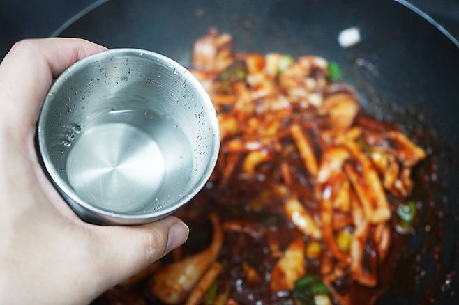 양념을 넣고 볶다 보면 팬에 양념이 눌어붙을 수 있어요.