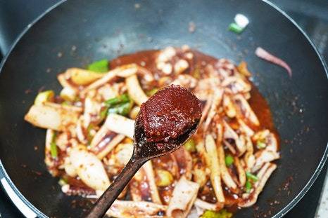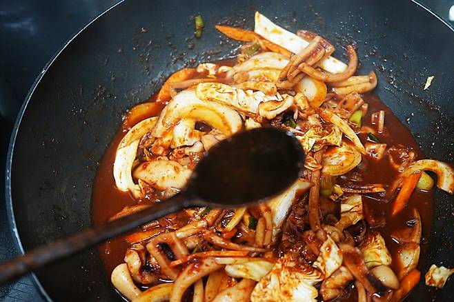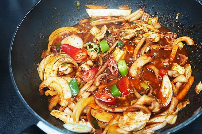 완성된 오징어볶음을 한 입 먹어봤는데,