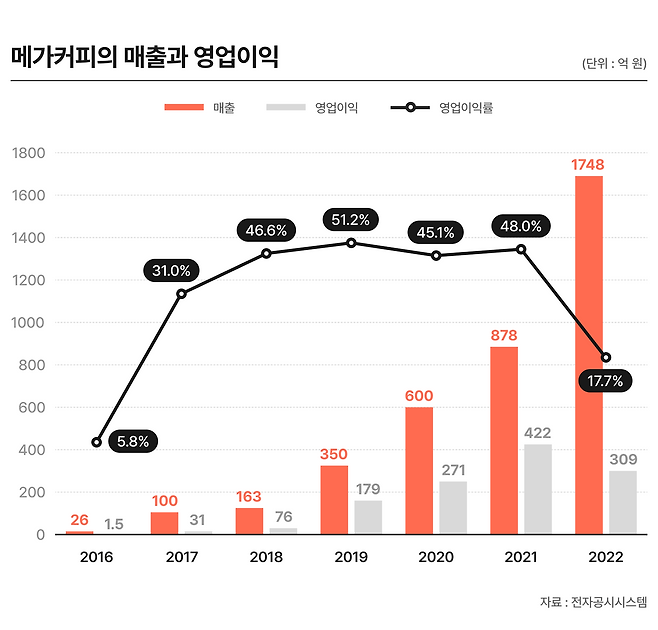 저 같은 사람이 한둘이 아닌 것 같아요. 2022년 메가커피의 연 매출이 1748억원으로 전년 대비 99% 증가했고, 영업이익은 309억원이에요. 투썸플레이스를 가볍게 넘어섰죠. 매출액으로는 투썸의 절반 가까운 메가커피가, 영업이익으로는 공룡을 꺾은 거에요.