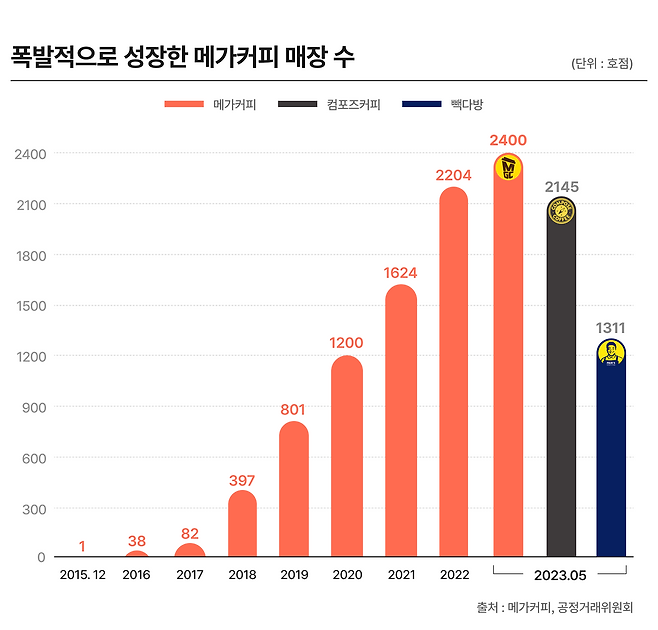 매장 수가 2400개면 얼마나 많은 걸까요? 쉽게 설명하자면 스타벅스보다 많아요. 2023년 5월 기준으로 전국의 스타벅스 매장 수는 1800여 개 정도입니다. 메가커피는 저가 카페 시장에서 가장 주목받는 리더입니다. 국내 저가 카페 3대장으로는 메가커피 외에 빽다방, 컴포즈커피가 꼽힙니다. 2023년 5월 기준으로 매장 수를 보면, 컴포즈 커피는 2145개, 빽다방은 1311개인 반면, 메가커피가 가장 앞서 있습니다.