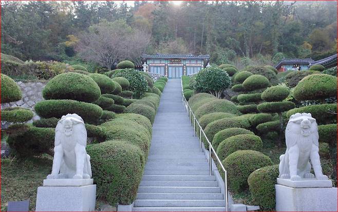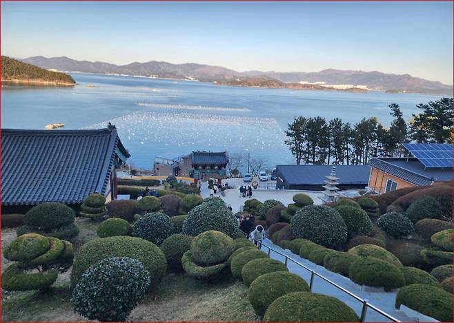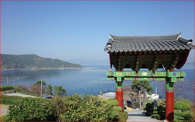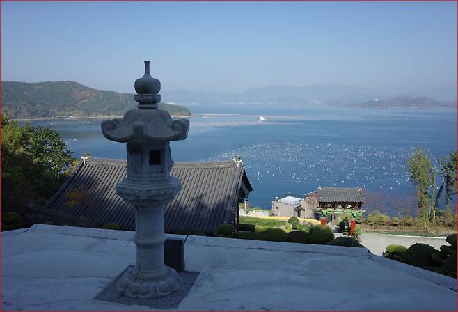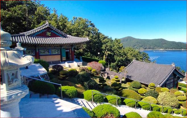 대웅전 앞마당:하늘과 바다가 겹쳐진 듯 수평선이 인상적인 포토존