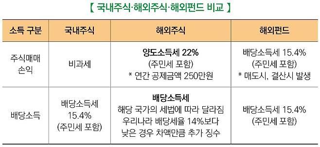 소액주주의 경우 양도소득세가 면제되는 국내 주식과는 달리 해외 주식투자는 모든 투자자에게 양도소득세를 부과한다. 즉 주식 매매손익(매매차익-매매차손)에서 250만원을 공제한 뒤, 이 금액에 대해 양도소득세 22%를 부과(지방소득세 포함)한다. 따라서 1년 동안 해외주식으로 번 순이익이 250만원 이하라면 세금을 낼 필요는 없지만, 250만원을 초과한다면 초과 금액에 대해 22%의 세금을 내야 하는 것이다. 이때 양도소득은 다음 해 5월 말까지 소득자가 직접 국세청에 소득신고 후 세금을 납부해야 하며 만일 세금 납부를 하지 않을 경우 가산세가 붙게 되어 주의가 필요하다.