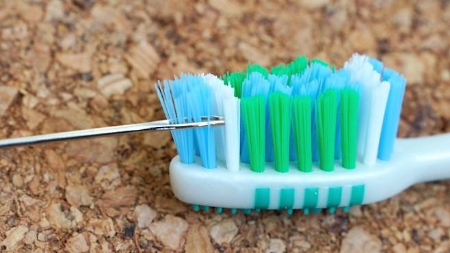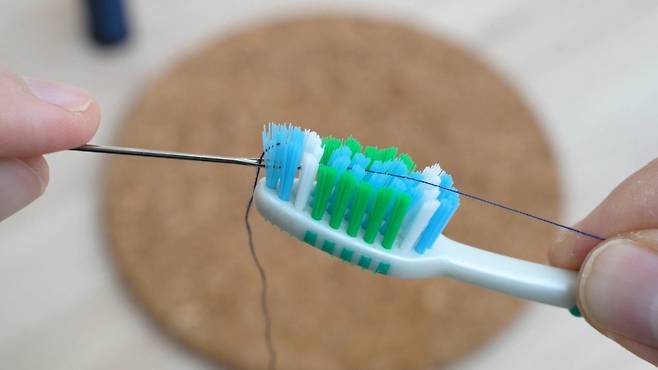 두 번째는 바로 칫솔에 바늘을 꽂아 사용하는 방법인데요. 바늘구멍은 눈이 좋아도 끼우기가 참 쉽지 않은데요. 칫솔을 이용하면 누구나 쉽고 간편하게 실을 끼울 수 있답니다.