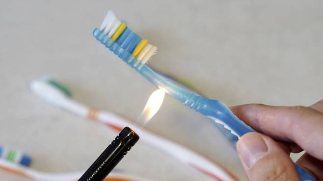 마지막 방법은 바로 라이터를 이용해 칫솔을 구부려 사용하는 방법인데요. 라이터로 칫솔 목 부분을 살짝 지져 주세요. 이때 불이 붙지 않도록 세기를 잘 조절하세요.
