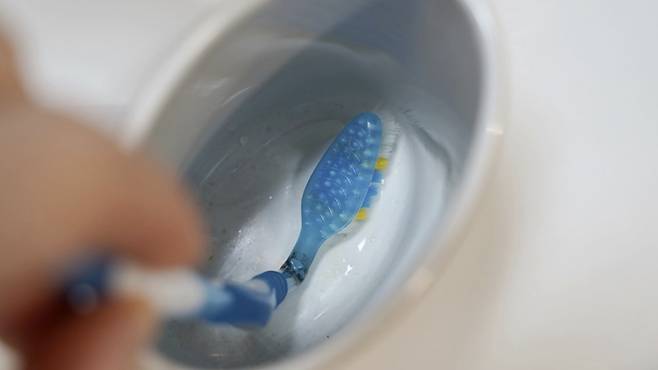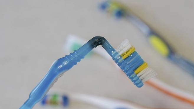 플라스틱이 말랑말랑 해졌을 때 안쪽이나 바깥쪽 방향으로 칫솔을 구부린 후 10초 정도 유지하세요. 그러면 칫솔이 단단하게 굳게 되는데요.