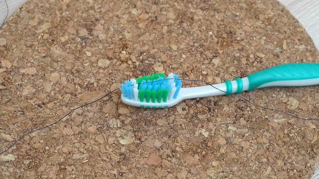 먼저 사용하려는 실을 칫솔 중앙에 놓아주세요. 실도 마찬가지로 중앙쯤으로 해서 놓아주시면 돼요.
