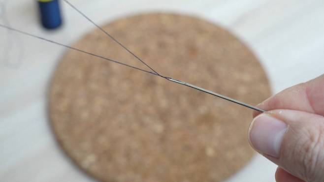 이제 실이 있는 곳에 바늘구멍을 꽂기만 하면 되는데요. 이렇게 하면 실이 도망가지 못하고 바늘구멍으로 쏙! 들어가게 돼요. 바늘구멍에 실이 들어갔다면, 손으로 잡고 함께 들어 올려 주세요.