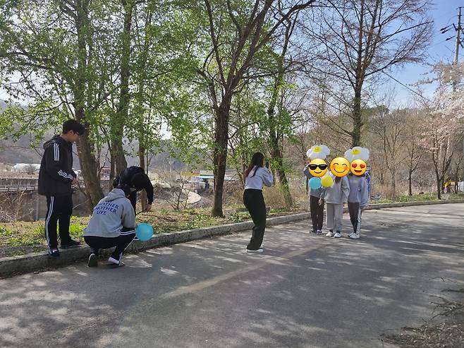 | ▲ 벚꽃이 피었다. 사진찍자 얘들아! 담임 선생님께서 1학년 친구들 사진 찍어 주는 동안 3학년 형님들은 뒤에서 자신들 차례를 기다리며 나뭇가지를 주워 놀고 있다. 단단한 내면의 힘 기르는 중. |