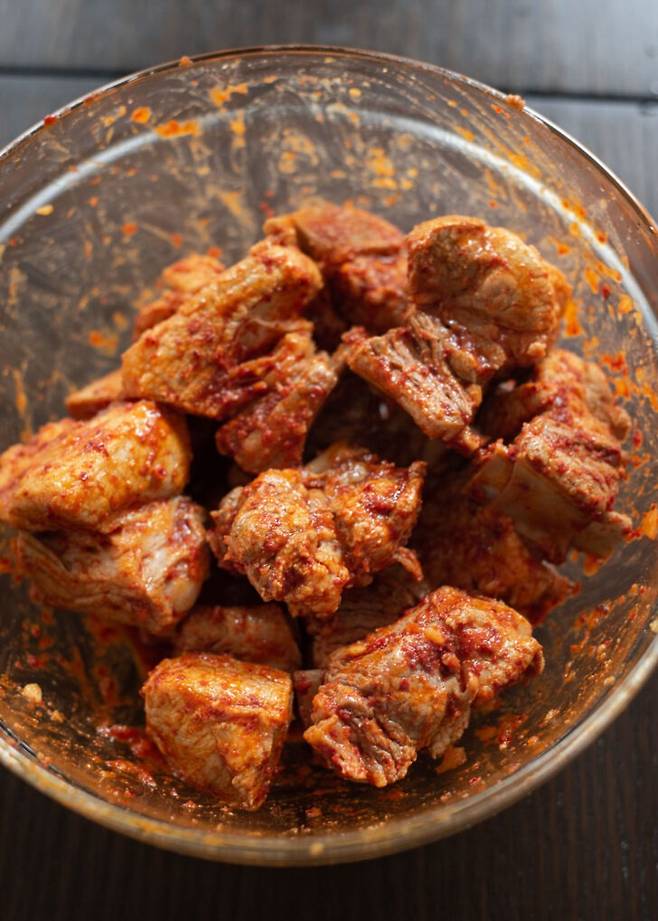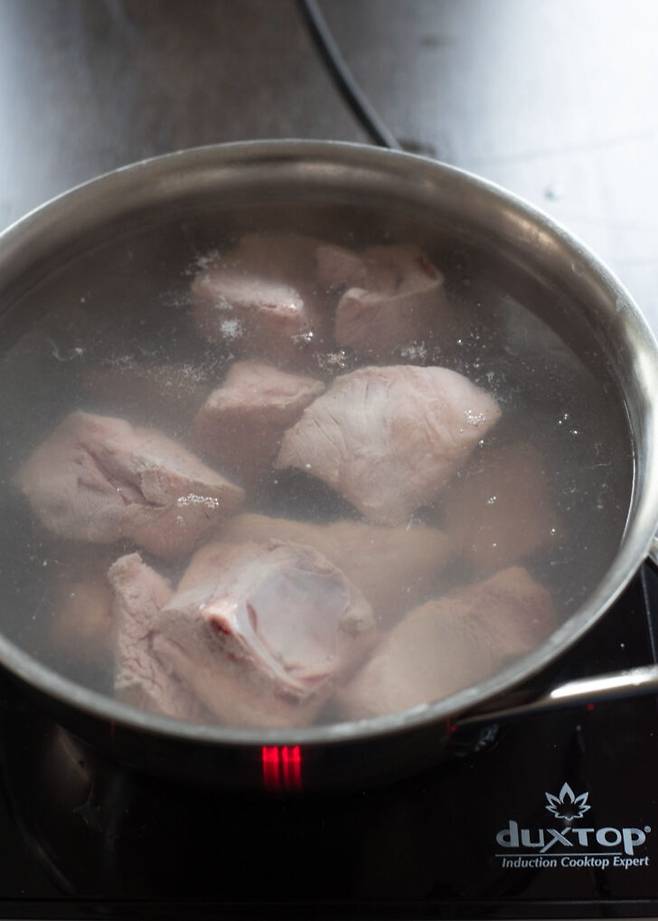 2. 돼지갈비는 끓는 물에 10분간 데쳐 기름기와 불순물을 빼고 찬물에 헹군다. (목살은 데치는 과정 생략 가능)