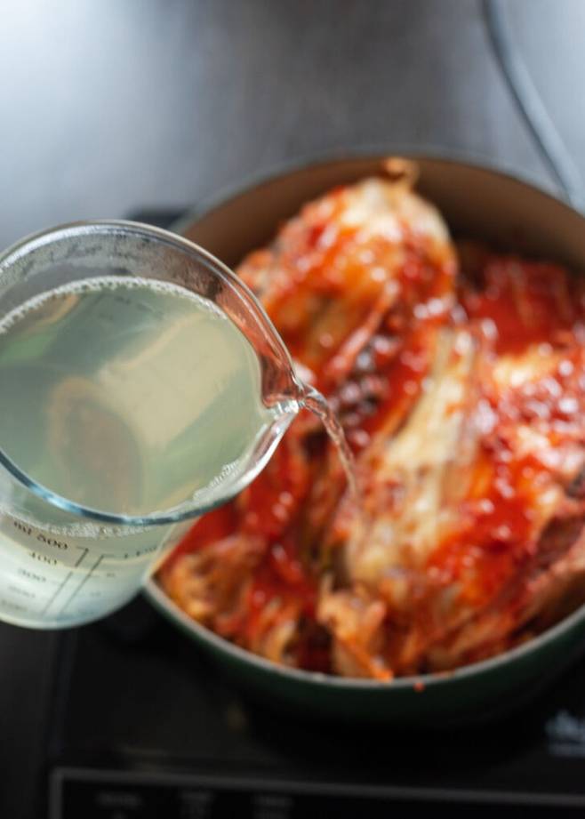 5. 준비한 멸치다시마 육수를 붓고 중불에서 끓이다가, 끓기 시작하면 약불로 줄여 45분간 뭉근히 졸인다.