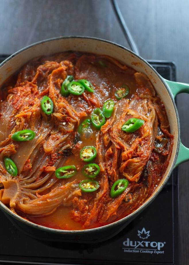 6. 김치를 한 번 뒤집어주고 30분 정도 더 졸여준다. 마지막에 대파와 청양고추를 넣고 5분 정도 더 끓이면 완성.