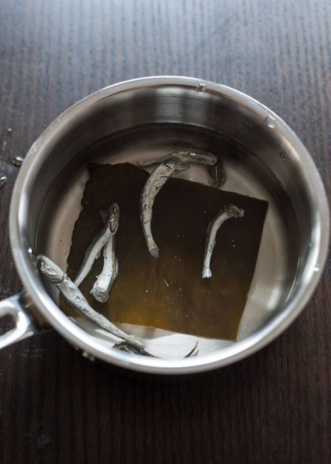 1. 멸치와 다시마를 물에 넣고 5분 정도 끓여 육수를 준비한다. 2컵 분량만 따로 덜어둔다.