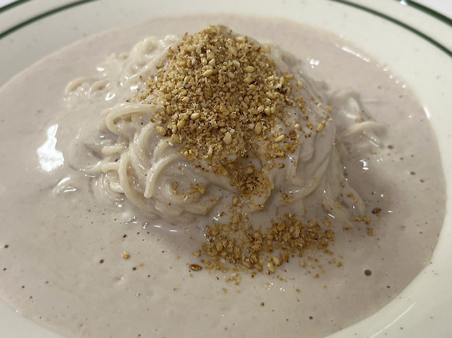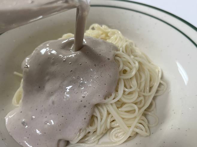 소면 위에 콩물을 부어서 완성해 보세요. 두부에 깨, 두유 등을 넣고 갈았을 뿐인데 몇 분만에 콩국수가 완성되었습니다.